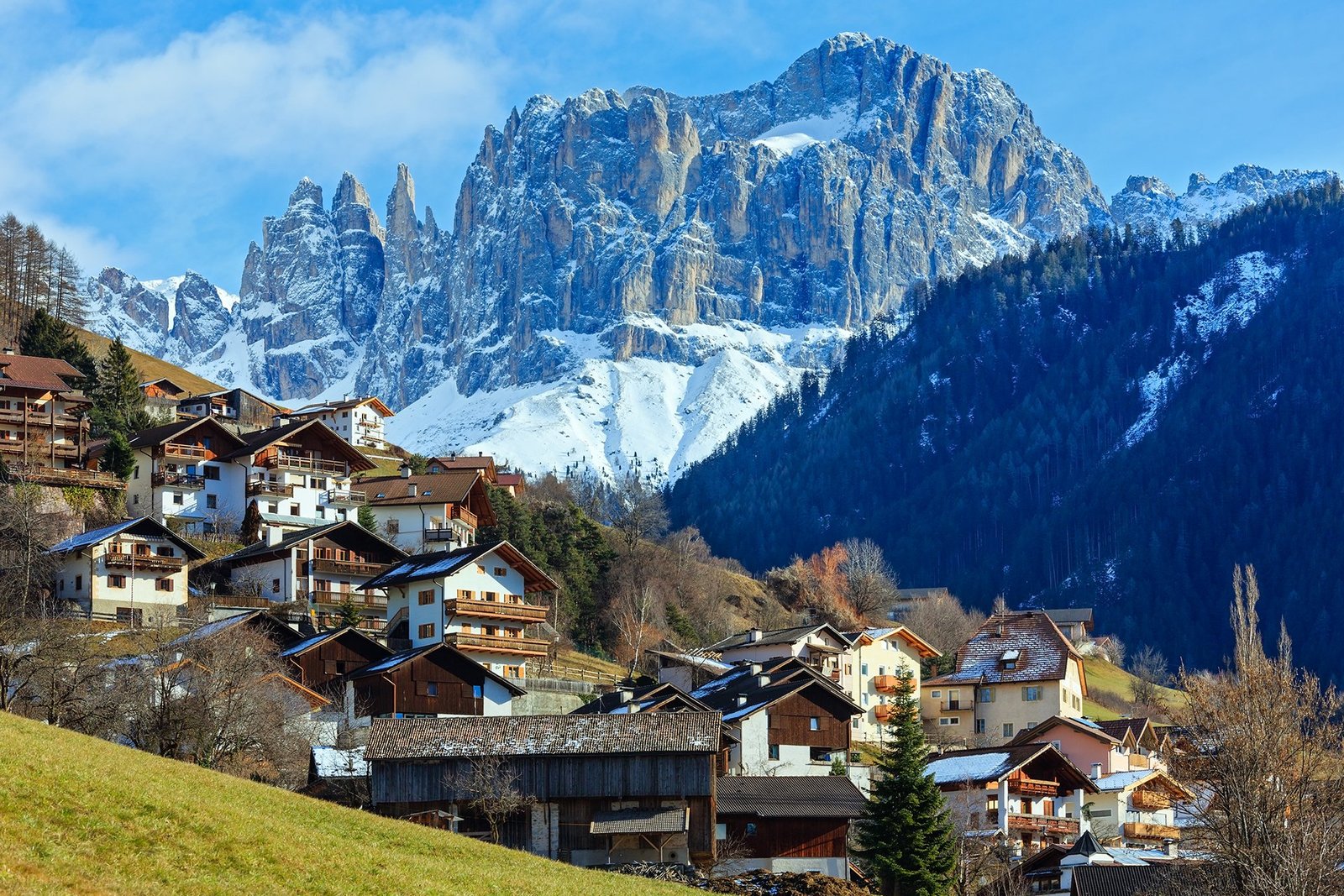 A beautiful shot of a small village surrounded by a lake and snowy hills